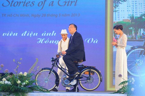 Ông Lê Thành Ân - Tổng lãnh sự Mỹ gốc Việt đầu tiên tại Việt Nam lên sân khấu đạp xe mobylette để kêu gọi mọi người tham gia đấu giá chính chiếc xe này.