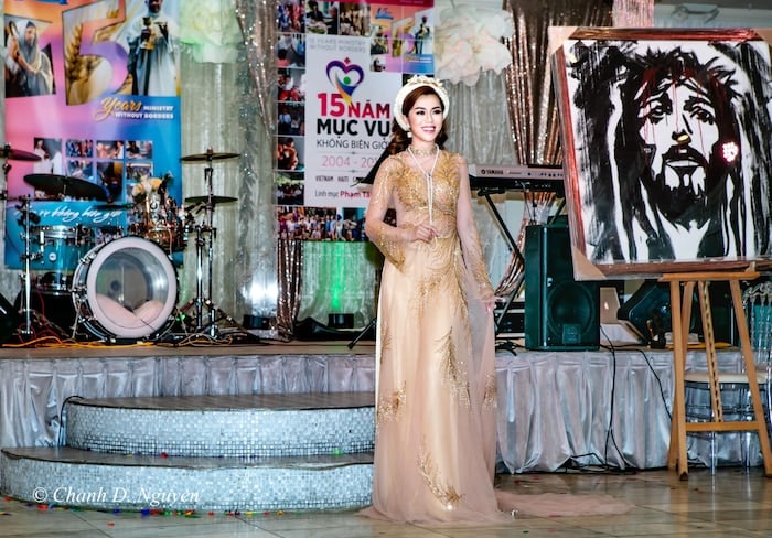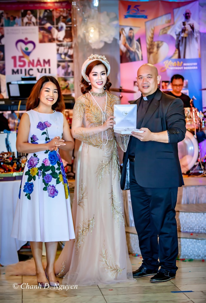 Trong tiếng nhạc dịu dàng trầm bổng của những nhạc công đặc biệt được tuyển chọn cho buổi tiệc thiện nguyện do Cha Josef Phạm tổ chức nhân dịp 15 năm làm Linh Mục, Hoa Hậu Vân Khương thu hút mọi ánh nhìn khi nhẹ nhàng bước ra trong bộ trang phục nền nã bằng lụa đính cườm mà NTK Jacky đã thiết kế đặc biệt cho nàng thơ của phần trình diễn thời trang giữa buổi tiệc.