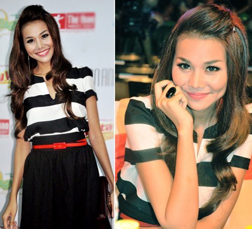 Đây là cách khó nhất vì nó phụ thuộc vào chính hiểu biết thời trang, con mắt tinh tế của mỗi người. Như trong bộ cánh này của Thanh Hằng, chiếc áo đen trắng sọc lớn đã khá "ngợp" thế nên chị ấy chỉ bổ sung một đôi khuyên màu ánh kim dạng sợi chỉ mảnh lấp lo sau mái tóc cùng chiếc nhẫn đá đen cá tính.