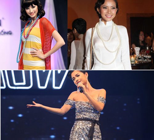 Tiếp theo là lựa chọn chất liệu trang sức hợp với phong cách và chất liệu trang phục. Trúc Diễm mặc đồ khá xì tin màu mè nên mix cùng vòng nhựa, Phan Như Thảo đang diện áo dài gấm, để tóc cổ điển nên vị trí của chuỗi hạt ngọc trai kia cũng rất phù hợp. Trương Quỳnh Anh cũng vậy, sẽ thật tệ nếu thay đôi bông tai lấp lánh kia bằng đôi khuyên nhựa hoặc khuyên bô hê miêng màu đồng.