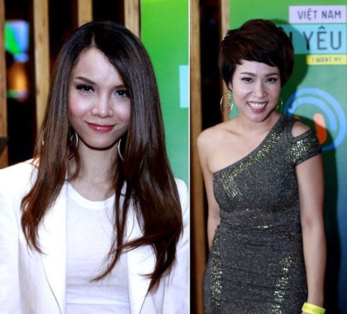 Yến Trang mặc vest trắng mix cùng khuyên vòng màu trắng, Uyên Linh mặc váy điểm màu vàng kim nên chọn khuyên vàng là hợp lý rồi.