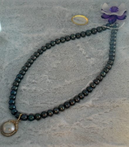 Màu đen ánh xà cừ xanh, tím cũng rất hiếm, mặt đeo là một hạt ngọc trai cỡ lớn